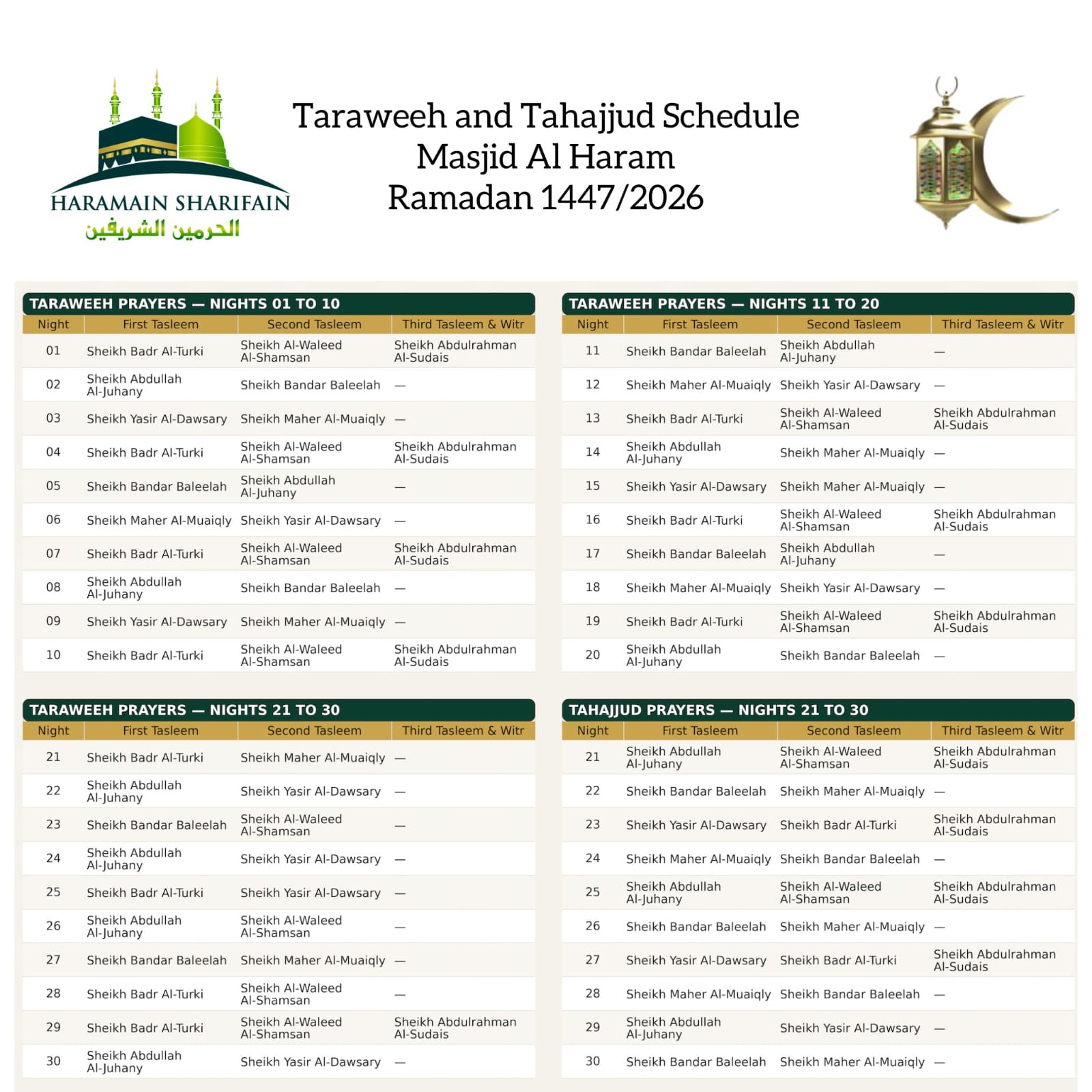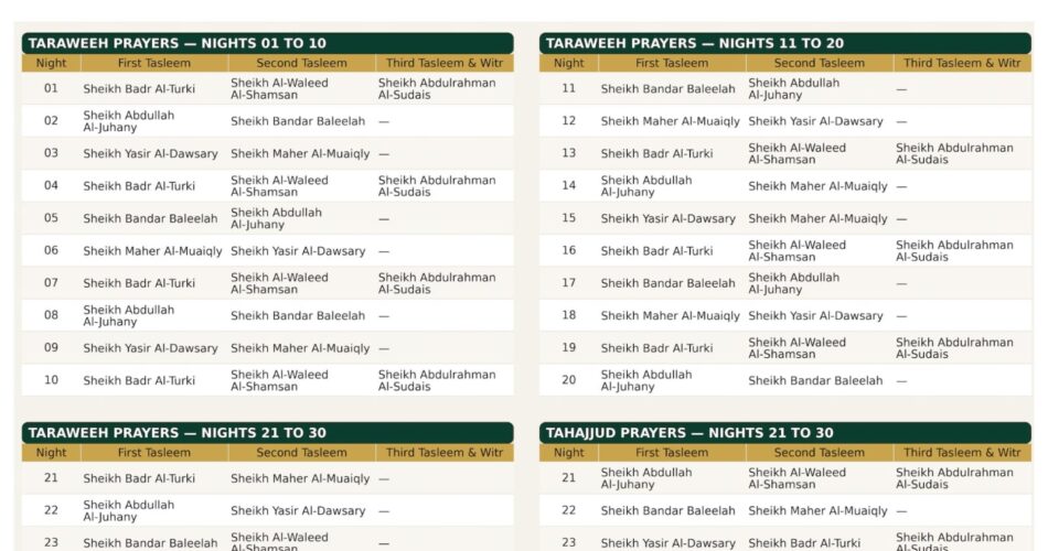यह शेड्यूल ग्रैंड मस्जिद और मस्जिद-ए- नबवी के धार्मिक मामलों के प्रमुख शेख अब्दुलरहमान बिन अब्दुलअजीज अल-सुदैस की मंजूरी के बाद जारी किया गया। जानकारी के अनुसार, मस्जिद अल हरम में आखिरी दस रातों की तहज्जुद नमाज में शेख अल-सुदैस भी इमामत करेंगे। उमराह पर जाने की योजना बना रहे जायरीन के लिए यह शेड्यूल काफी मददगार साबित होगा, जिससे वे अपनी इबादत की बेहतर तैयारी कर सकेंगे। रमजान में हरमैन शरीफैन में इबादत का यह मौका लाखों मुसलमानों के लिए आध्यात्मिक अनुभव बन जाता है।